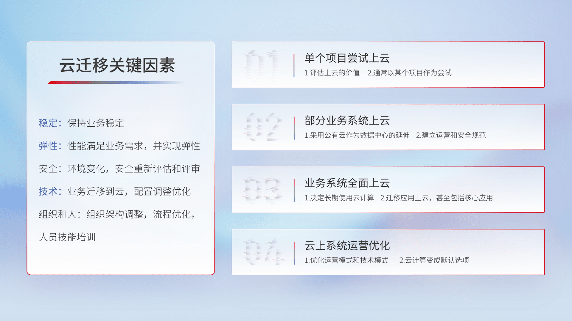 结合实际业务,,,,从规划设计、、云平台选型、、、、云原生改造、、、、数据迁移、、集成交付,,,,迁移全过程为客户识别最佳上云路径,,,,做好风险识别管理,,设计网络架构、、身份权限、、、、安全审计合规、、操作审计、、日志审计、、监控告警策略、、、多站点容灾设计等,,,对云上基础设施进行整体规划,,提升IT治理水平,,以满足弹性、、高可用、、高性能的需求。。。