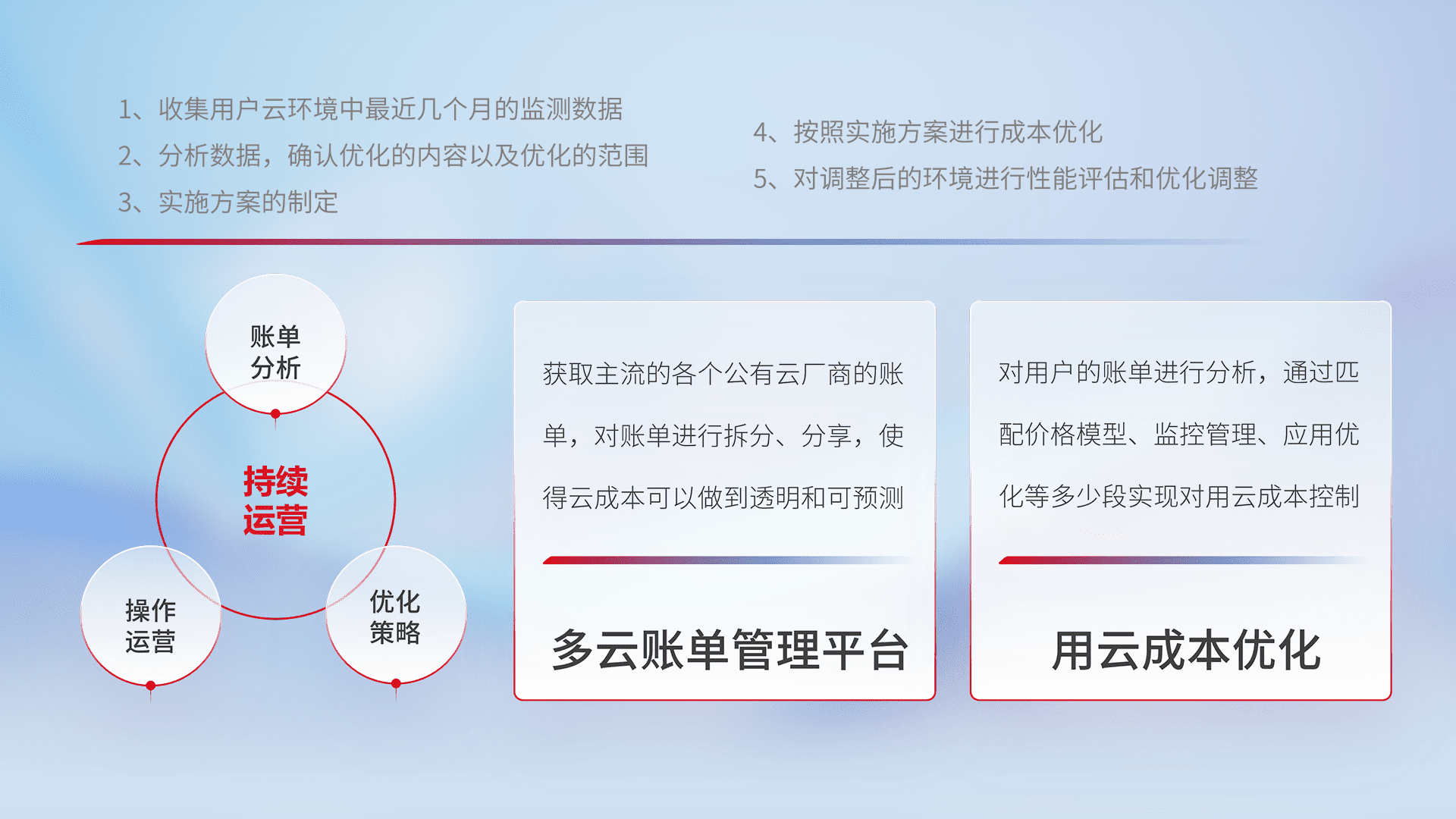 通过多云纳管,,,,以统一的资源数据模型把客户的云资源进行抽象和封装,,,,进而实现对多云资源的统一操作,,,,保障云资源管理的可靠性、、、、稳定性与可用性。。。量身定制化运维内容,,配置、、、、开发运维、、补丁管理、、备份、、、监控、、认证和访问管理、、、审计和日常巡检等,,,保障在用云过程中的可靠度,,,,稳定度以及高可用率。。